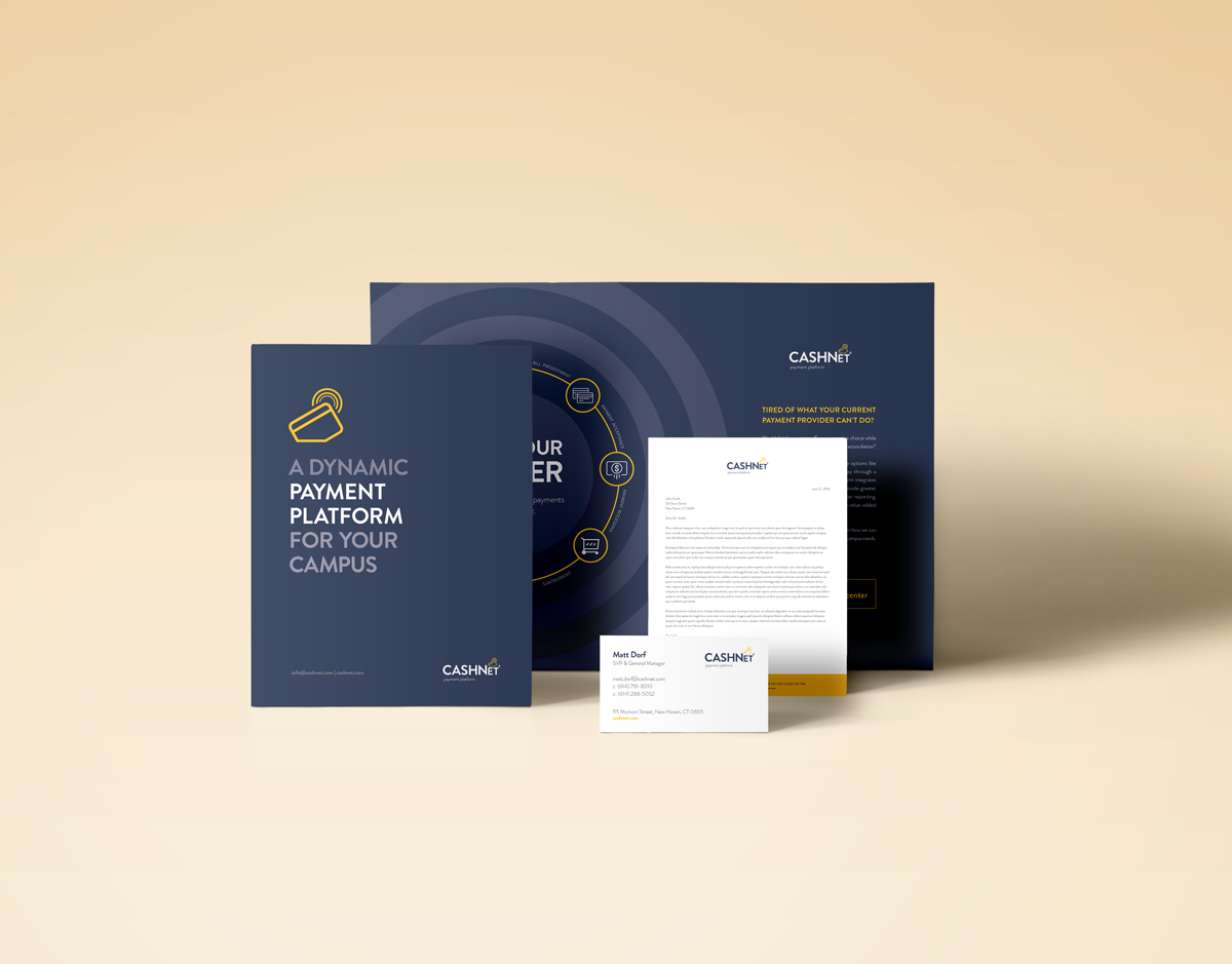 Brochure, Business Card, Letterhead, Two-page spread ad for University Business Magazine